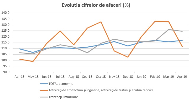 Tranzacțiile imobiliare, însă, au avut o creștere mai accentuată, atât față de domeniul arhitecturii, cât și față de economie. Astfel, cifra de afaceri din acest sector a crescut cu 24,7% în luna aprilie, față de aceeași perioadă a anului 2018, ca serie ajustată în funcție de numărul de zile lucrătoare și de sezonalitate.