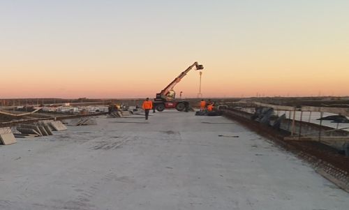 Pasajul pe autostradă peste CF800 București – Constanța– se lucrează la antretoaze, montarea predalelor de beton peste grinzi și la umpluturile în spatele culeelor;