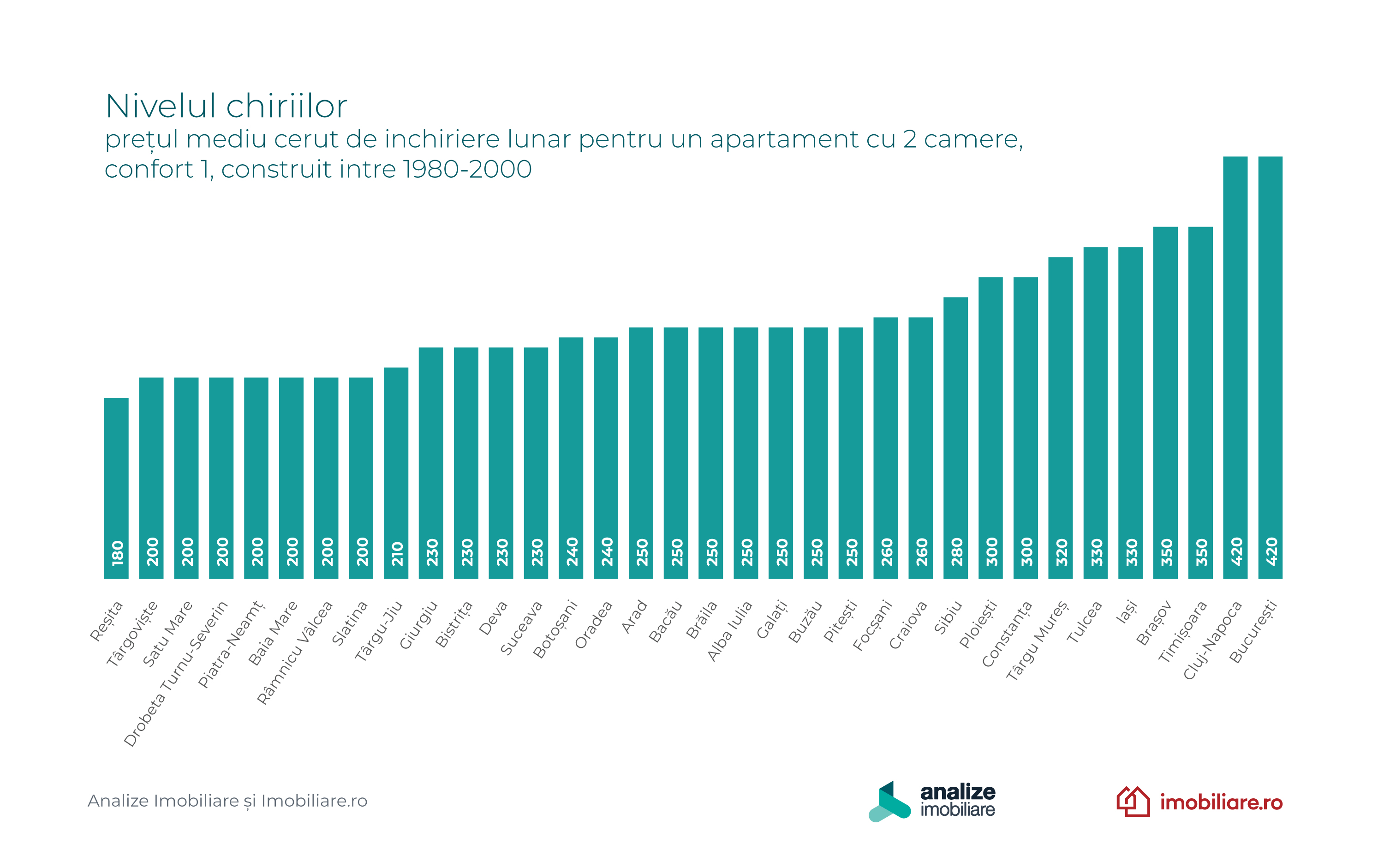 Iașiul, pe de altă parte, a consemnat o scădere în acest interval de timp, de la un nivel de 350 de euro pe lună, la 330 de euro pe lună.