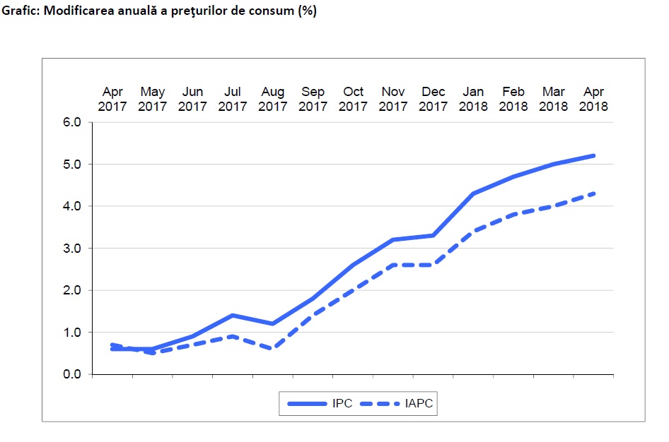 Inflația a continuat să crească, prețurile de consum fiind mai mari 5,2% în luna aprilie a acestui an față de aceeași lună a anului trecut, potrivit datelor furnizate de Institutul Național de Statistică.