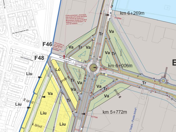 Planul prevede realizarea în jurul giraţiei de sub pasajul dintre Calea Aradului – DN 79 a patru drumuri adiacente care să permită virajul la dreapta, fără ca vehiculele să mai intre în giraţia de sub pasaj.