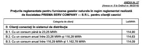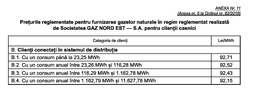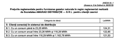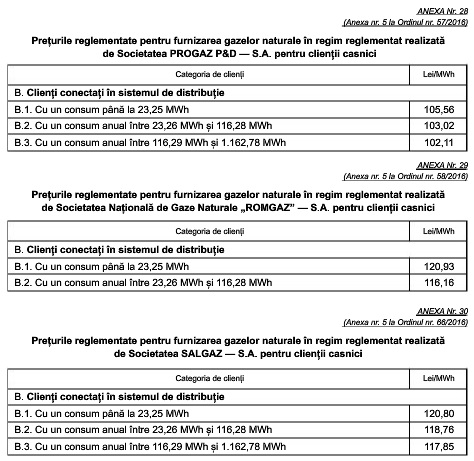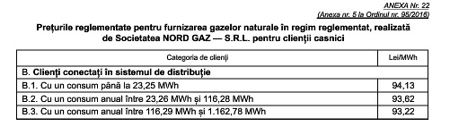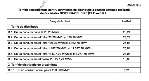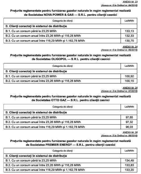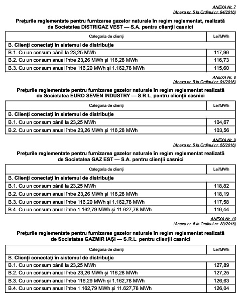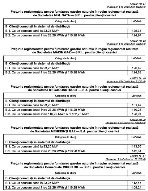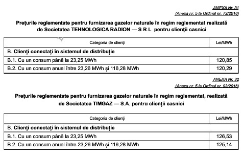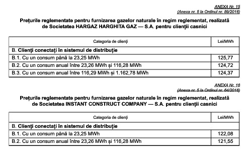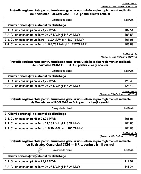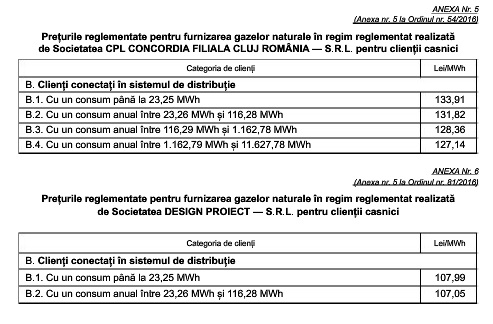 Tarifele reglementate pentru distribuția gazelor naturale, precum și prețurile pentru furnizarea reglementată au fost stabilite prin ordine ale președintelui Autorității Naționale de Reglementare în Domeniul Energiei.