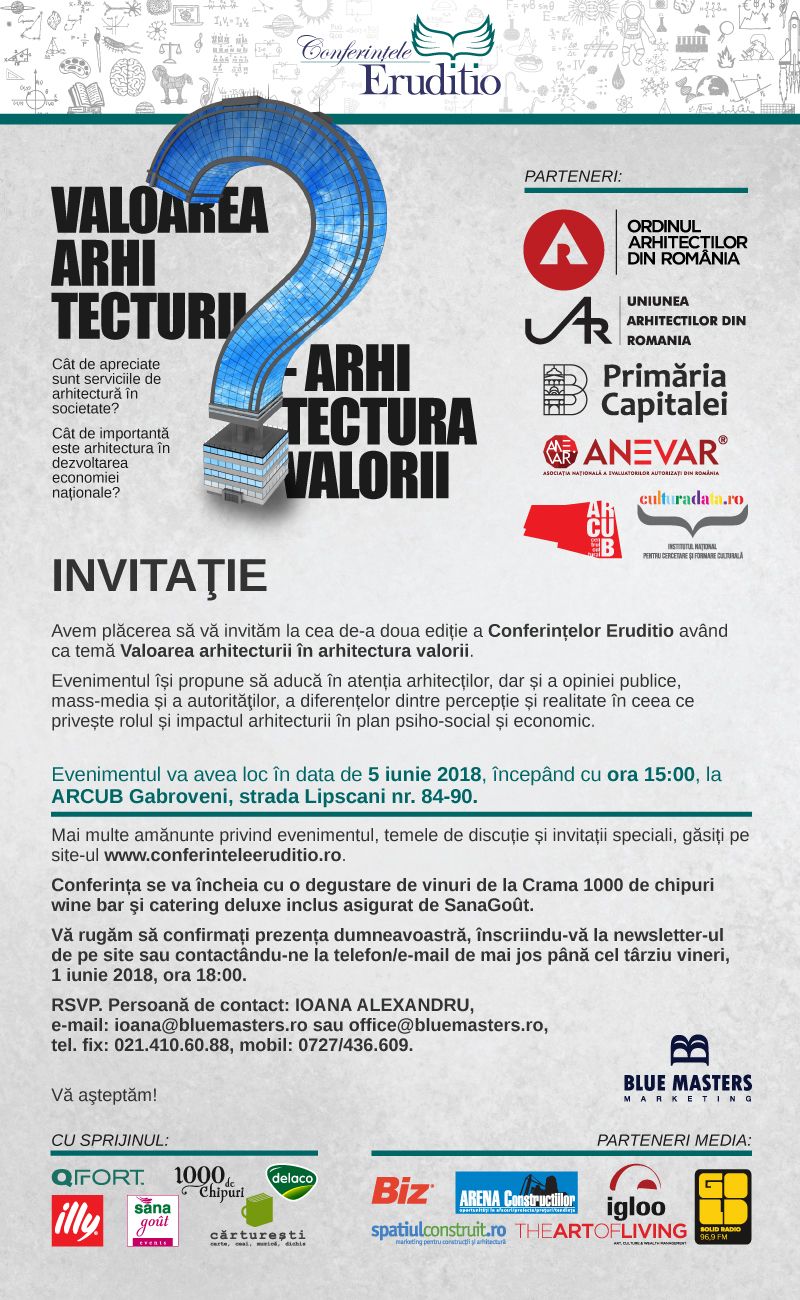 A doua ediţie a Conferinţelor Eruditio dedicate arhitecturii va avea loc pe 5 iunie 2018, începând de la ora 15:00, la ARCUB Gabroveni. Membrii Ordinului Arhitecţilor din România (OAR), ai Uniunii Arhitecţilor din România (UAR), ai Asociaţiei Naţionale a Evaluatorilor Autorizaţi din România (ANEVAR), studenţii la arhitectură şi reprezentanţii mass-media îşi pot rezerva participarea gratuită la eveniment înscriindu-se la office@bluemasters.ro.