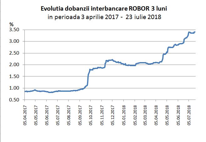 Dobânda interbancară ROBOR pentru depozitele pe termen de 3 luni, cea care este luată ca referință de băncile comerciale atunci când stabiliesc dobânzile pentru creditele ipotecare, a ajuns astăzi la 3,41%. Acest nivel este unul dintre recordurile ultimilor patru ani, atingând un nivel similar în februarie 2014 când a fost 3,46%, conform datelor furnizate de Banca Naţională a României (BNR).