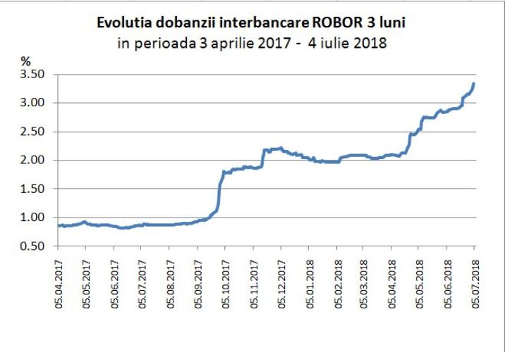Nivelul de 3,34% a fost atins astăzi de dobânda interbancară ROBOR pentru depozitele pe termen de 3 luni. În urmă cu exact un an această dobândă avea nivelul de 0,86% !