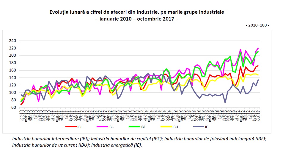 Cifra de afaceri din industrie, în luna octombrie 2017, faţă de luna octombrie 2016, a crescut pe ansamblu cu 17,2%, ca urmare a creşterilor din industria extractivă (+30,1%) şi industria prelucrătoare (+16,9%).