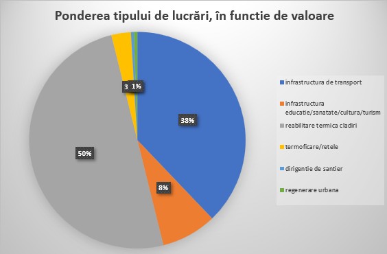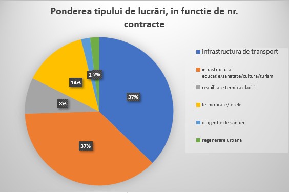 Deși infrastructura de transport și cea educațională, sanitară, de cultură și turistică au cea mai mare pondere ca și număr de contracte, situația se schimbă în ceea ce privește ponderea în funcție de valoarea contractelor, grupate pe tipuri de lucrări, raportată la valoarea totală.