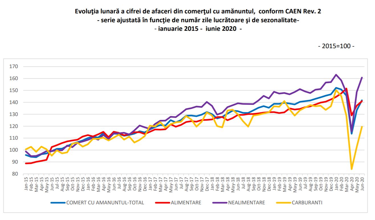Afacerile din comerț și-au revenit parțial după căderile din perioada stării de urgență. Cele mai afectate rămân benzinăriile. Cel mai bine au mers vânzările de produse alimentare, băuturi şi tutun. Dar, și vânzările de produse nealimentare au revenit pe creștere în luna iunie.